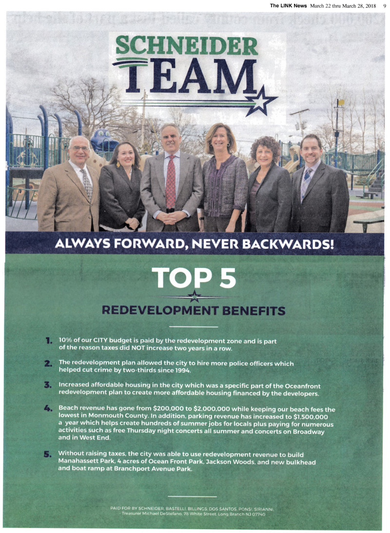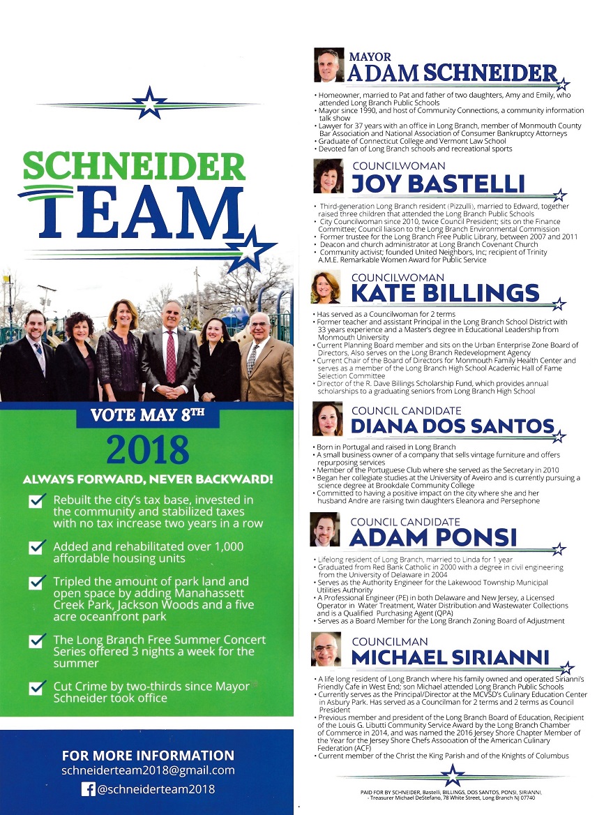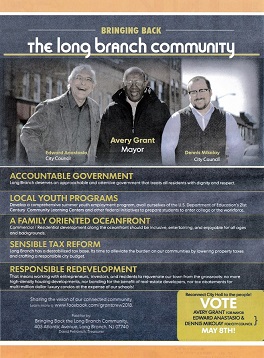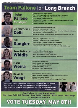 - Stay in touch with Long Branch Mayor and Council: John Pallone (first elected Mayor in 2018) and City Council incumbent members Rose Widdis, Bill Dangler, Mario Vieira and Dr. Anita Voogt, along with Glen Rassas (lifelong resident, appointed November 2024 to succeed 30-year member Dr. Mary Jane Celli who passed away in October 2024).